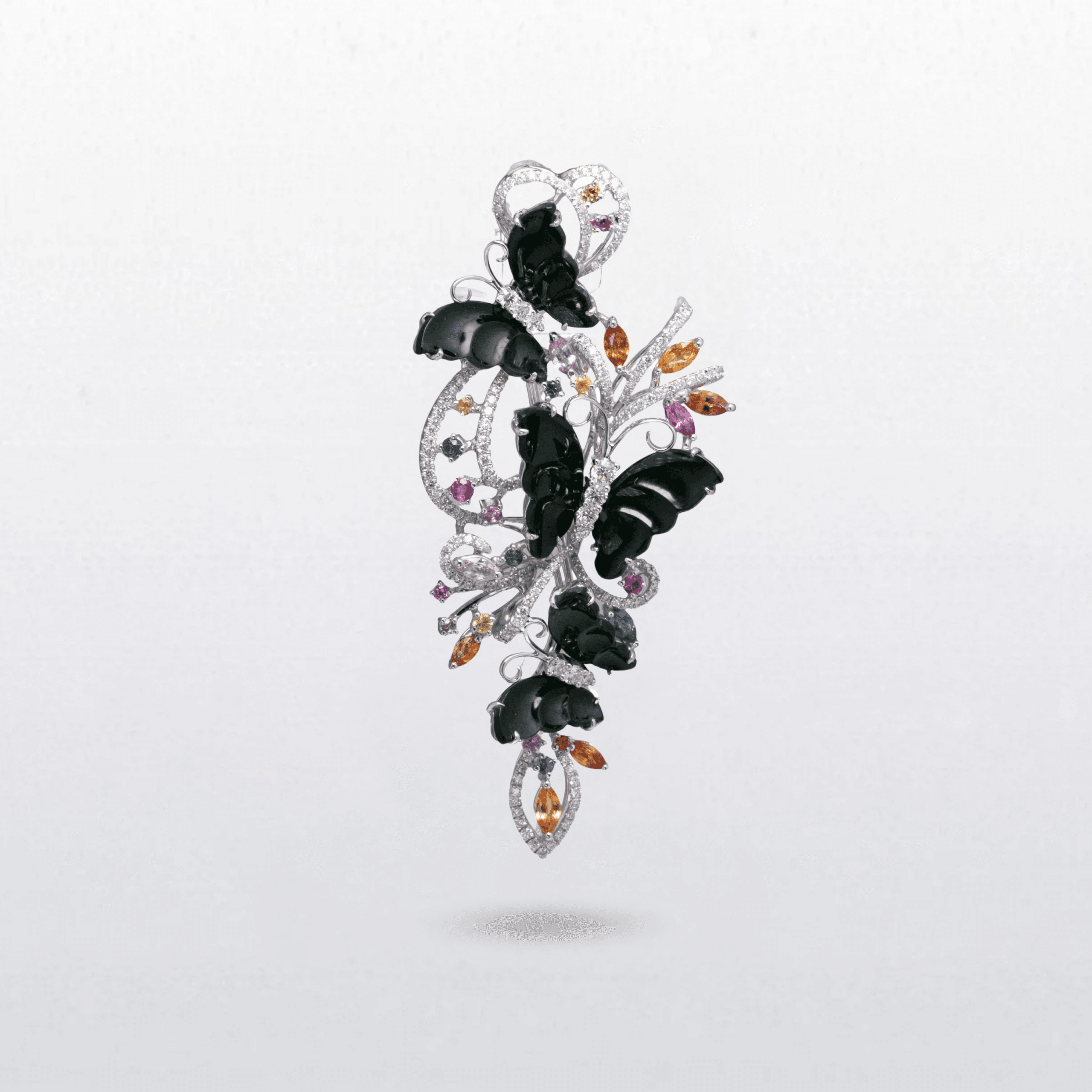 A delicate butterfly pendant crafted in white gold, featuring sculpted jade wings set among flowing diamond-set vines and vibrant coloured sapphires. The lively arrangement of sapphires adds brilliance and movement to the design, evoking butterflies fluttering through a blooming garden. An elegant nature-inspired creation that combines colour, light and intricate craftsmanship.
