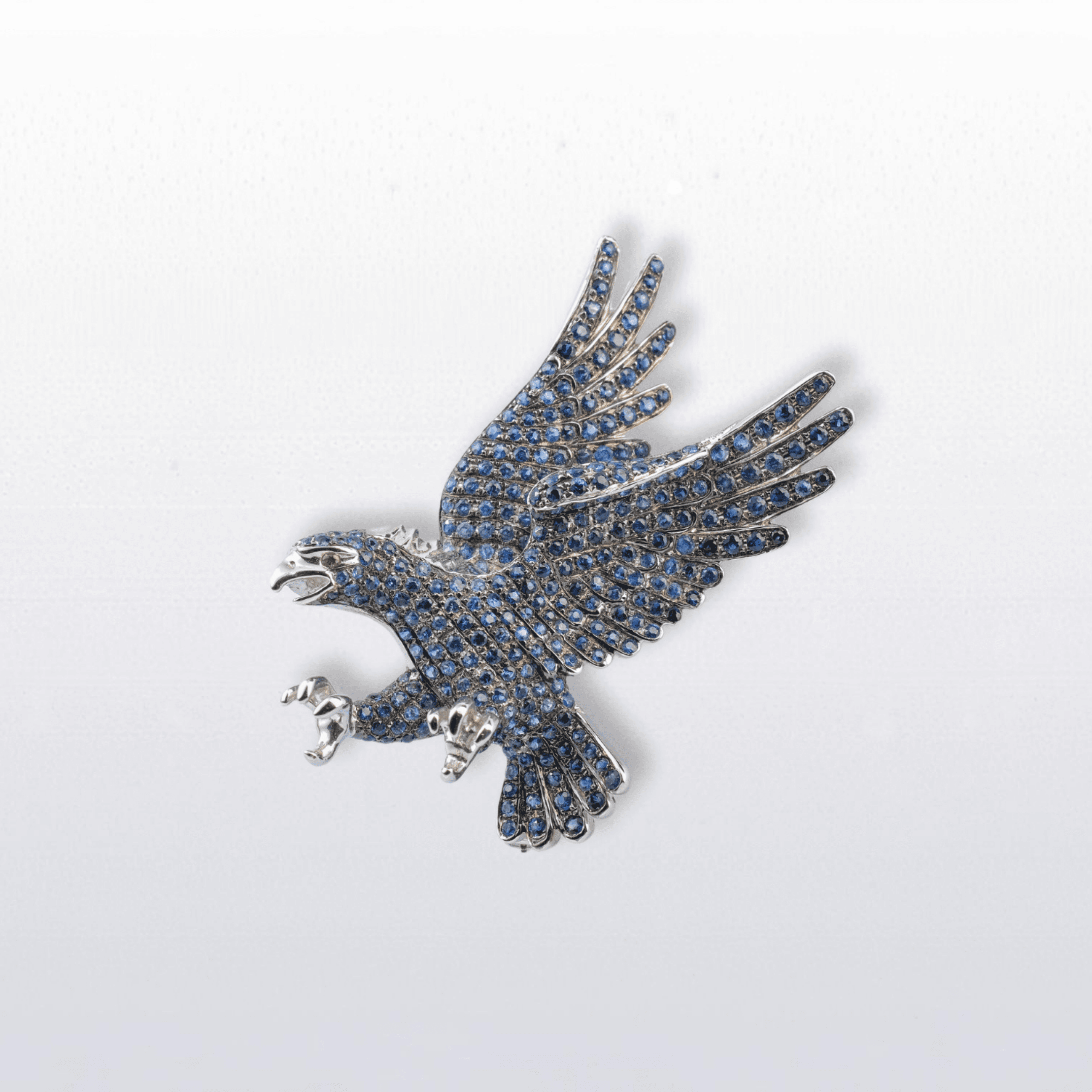 A striking eagle in full flight, this statement brooch is meticulously pavé-set with vibrant blue sapphires that create depth, movement, and a lifelike sense of motion. Rubies accents the eye, adding an intensity that brings the piece to life. Crafted in 18K white gold, this design captures both strength and grace — perfect for collectors, evening wear, or anyone drawn to powerful symbolism.