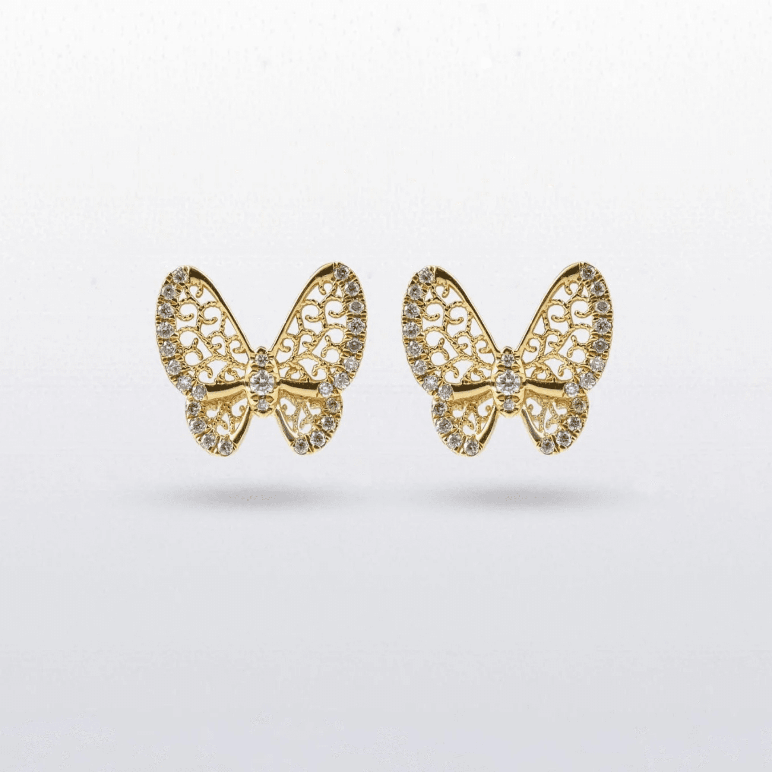 Inspired by the lightness of flight, these butterfly earrings feature intricate filigree wings accented with shimmering diamonds. Elegant and uplifting, they add a touch of graceful radiance to any occasion.