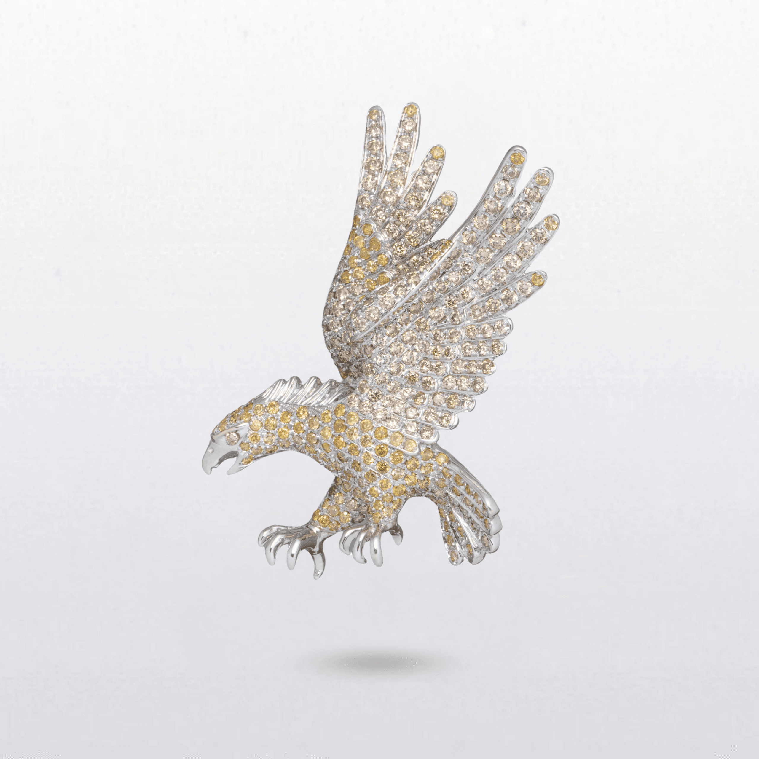 A striking eagle brooch crafted in white gold, set with fancy coloured diamonds. Captured mid-descent with wings fully outstretched and talons extended, the design conveys the power and precision of the majestic bird of prey. Intricately pavé-set stones highlight the sculpted feathers and contours, creating exceptional brilliance and depth while emphasising the dynamic movement of the eagle in flight.