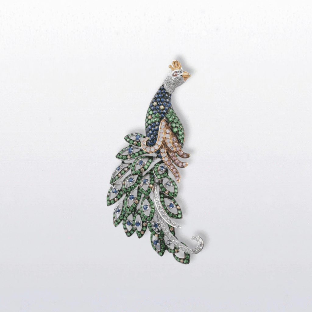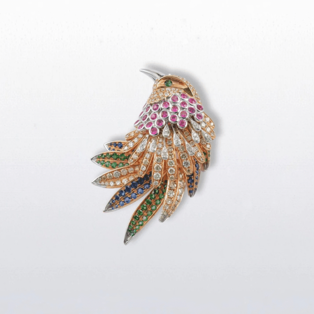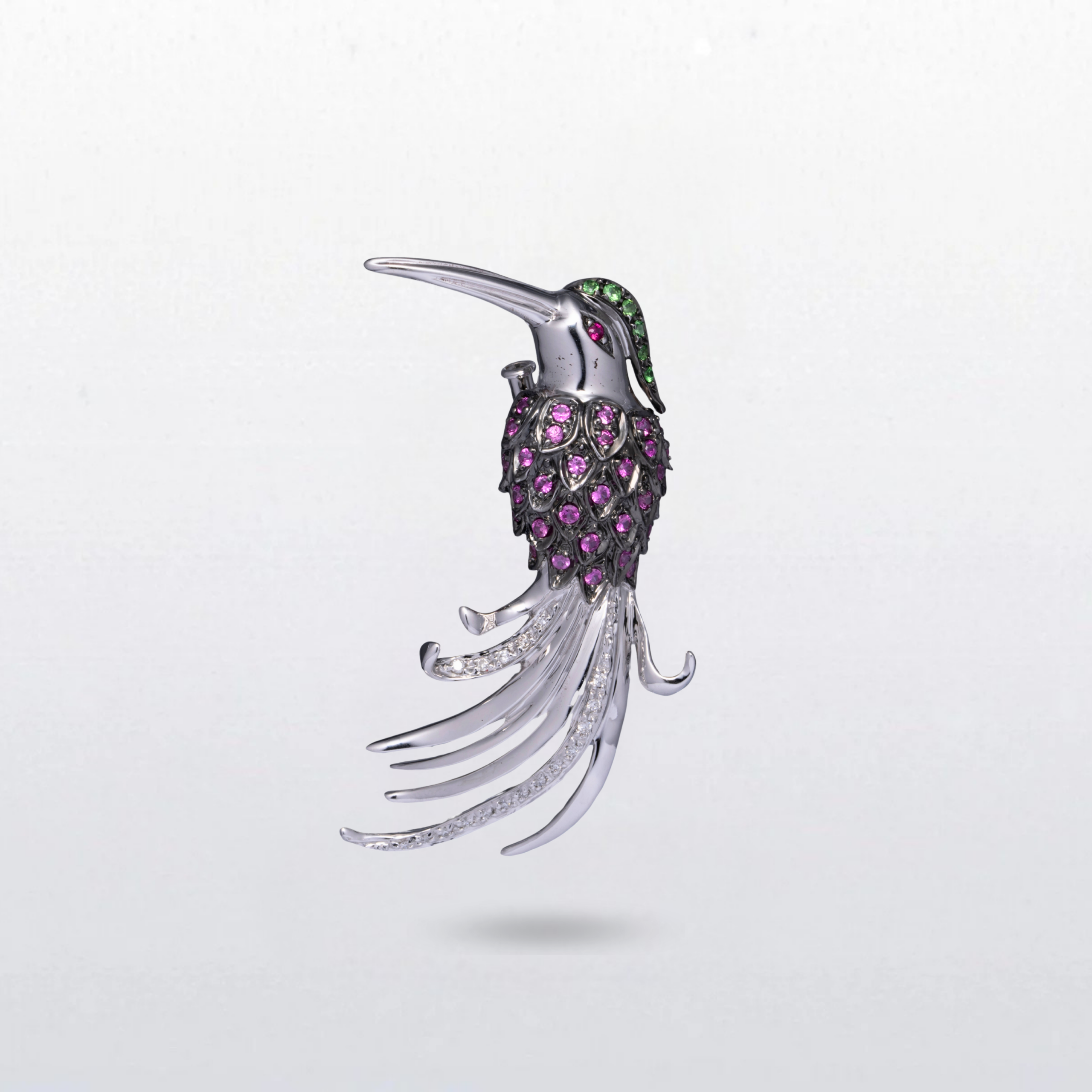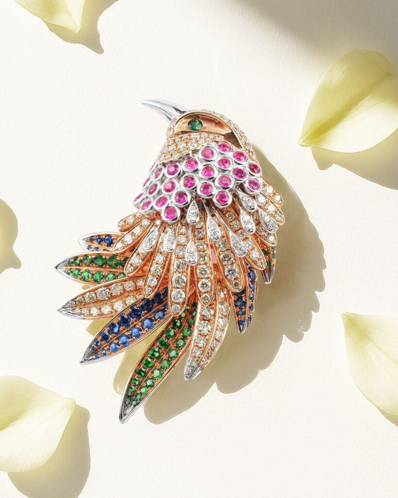 A delicate hummingbird-inspired brooch capturing a sense of lightness and motion. Flowing gem-set feathers form an elegant, sweeping look — graceful, refined, and full of life.