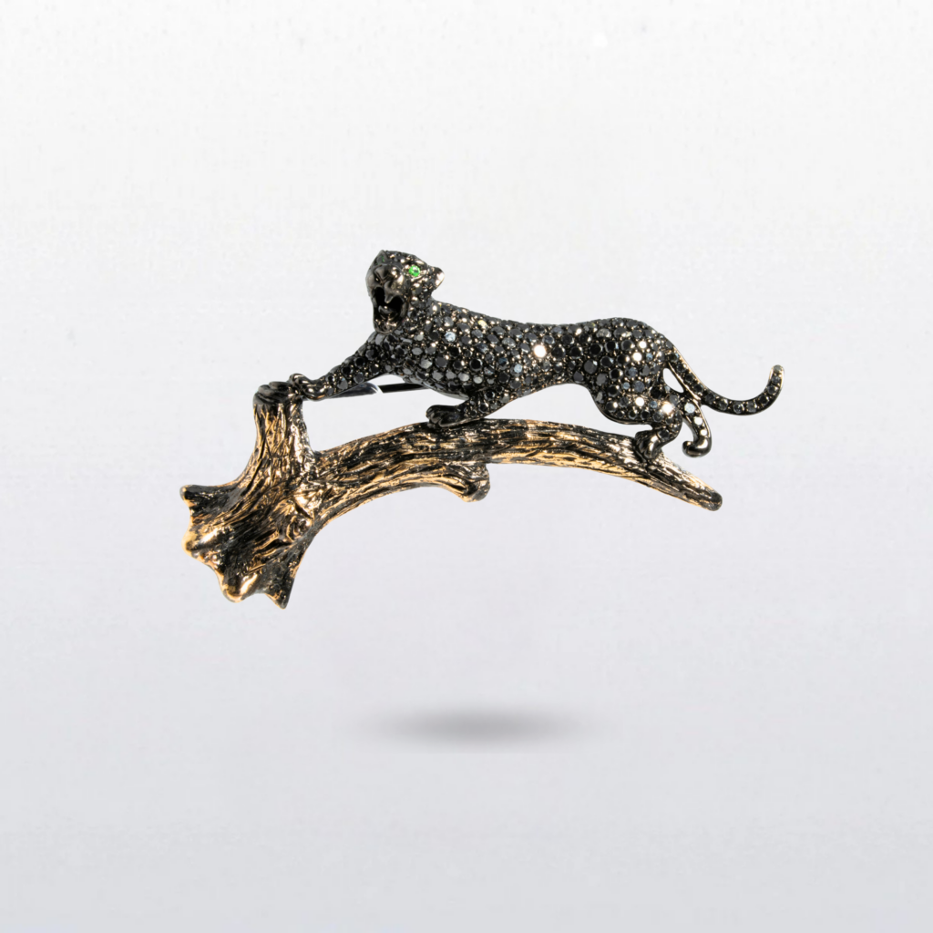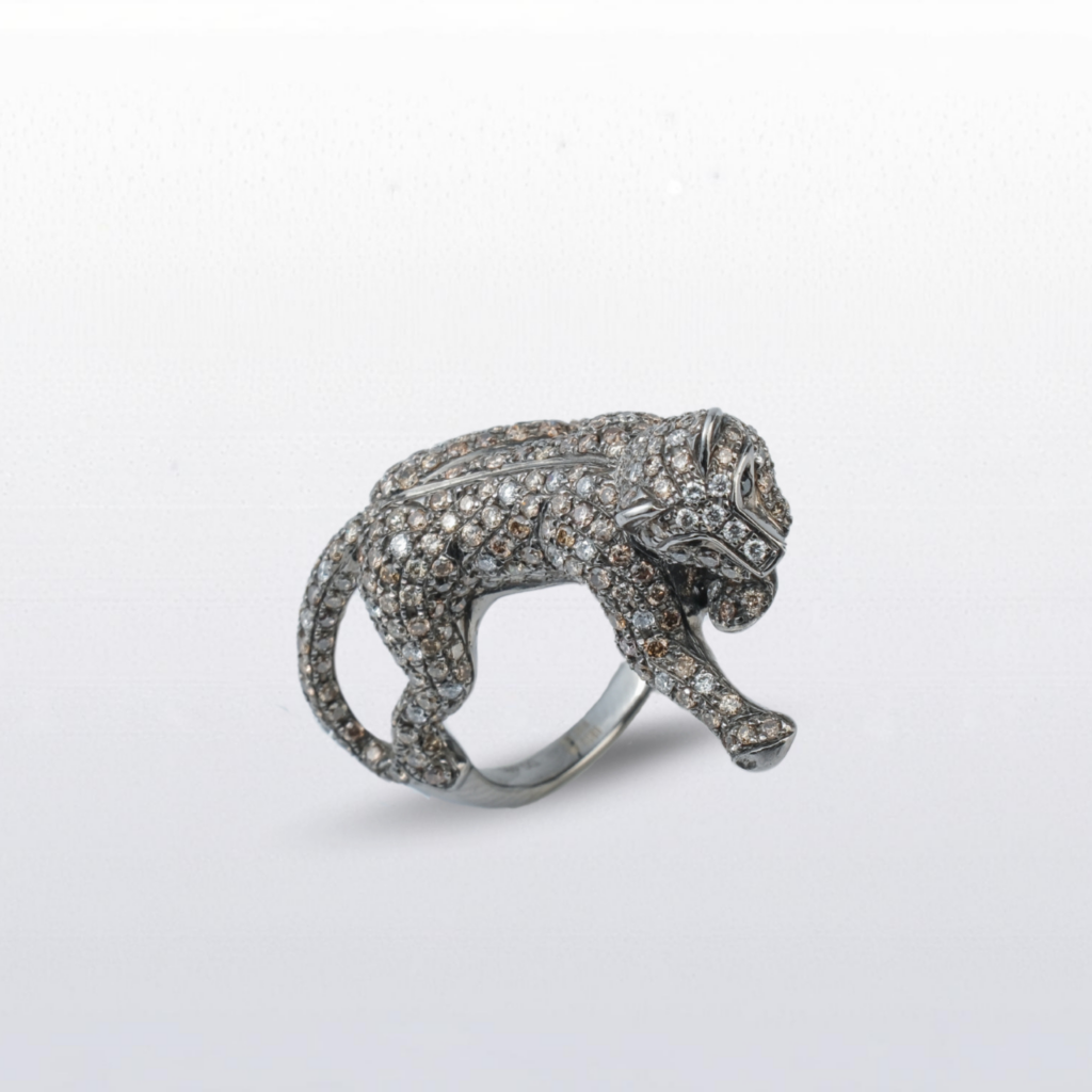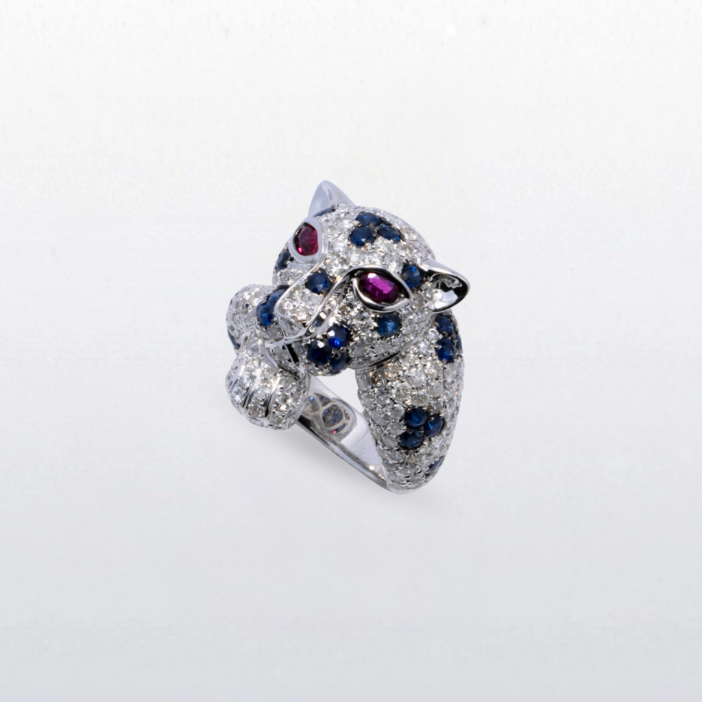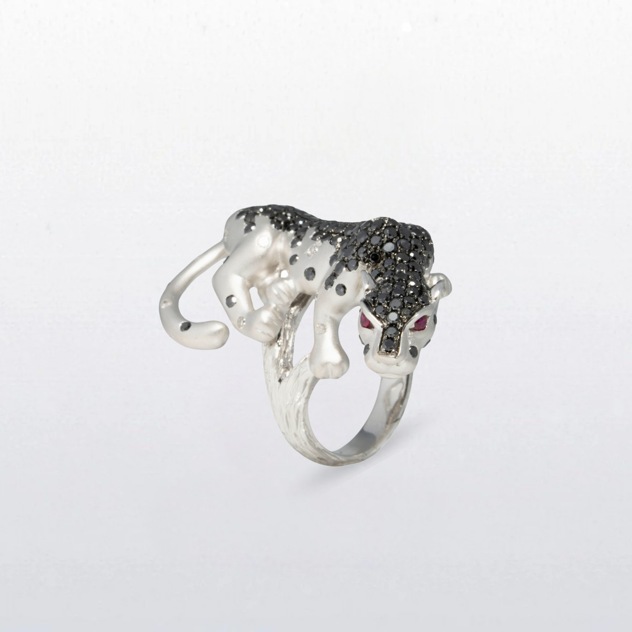 A striking leopard ring capturing the quiet intensity of a prowling big cat. Sculpted in a sleek, fluid form, its body is accented with black diamonds to evoke natural spotting, while ruby eyes bring it to life.