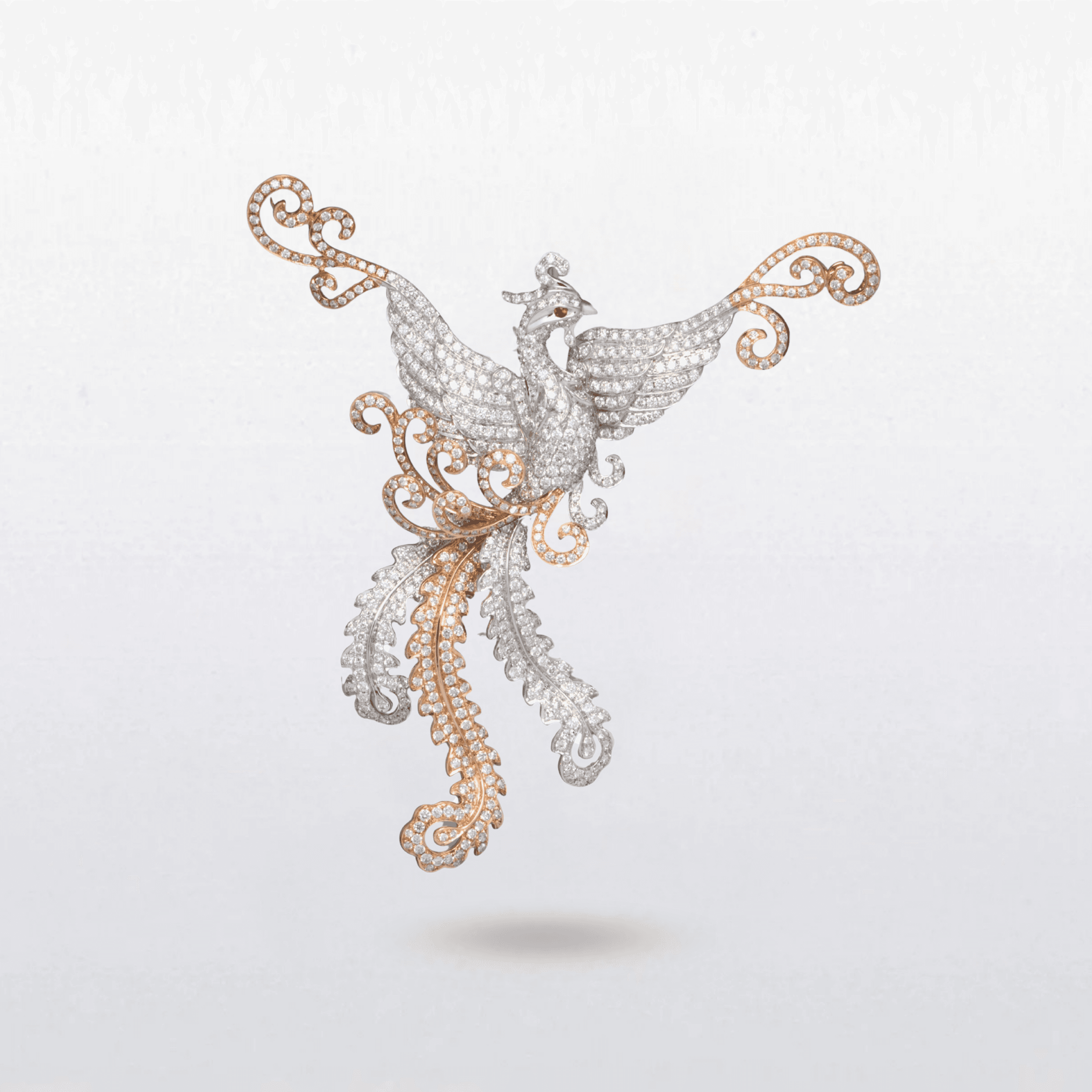 A majestic phoenix pendant crafted in white and rose gold, set with brilliant-cut diamonds and accented with a ruby eye. The outstretched wings and flowing tail feathers are intricately pavé-set, while elegant rose gold scrollwork adds warmth and contrast to the design. Symbolising renewal, strength and rebirth, the phoenix is captured in a graceful moment of ascent, combining dynamic movement with refined craftsmanship.