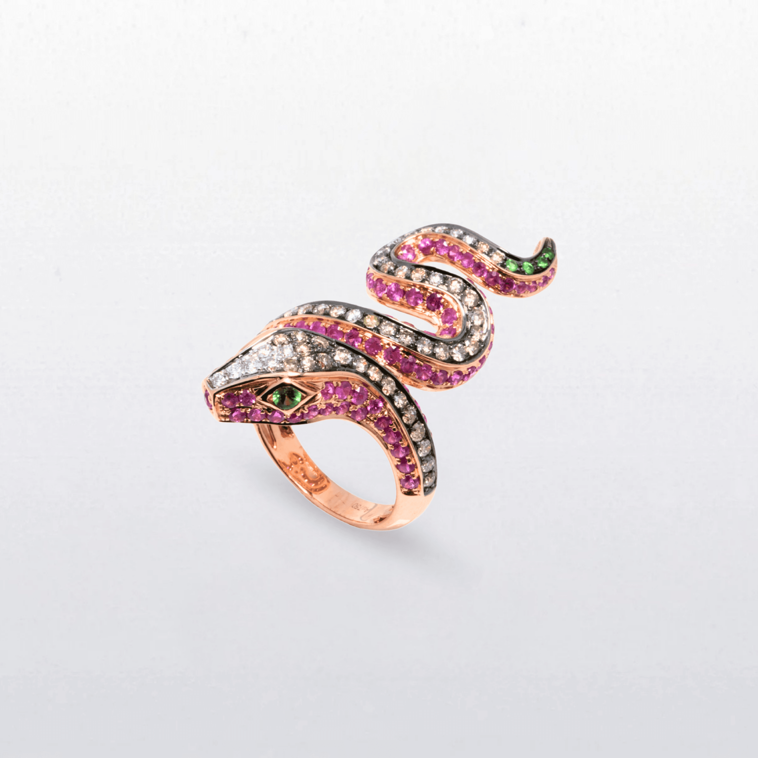 A striking serpent in motion, this ring coils with fluid elegance, set in vibrant pink sapphires, brown diamonds, and vivid green garnets. Sculpted in warm rose gold, it captures a sense of movement, transformation, and quiet power — a bold piece that commands attention.