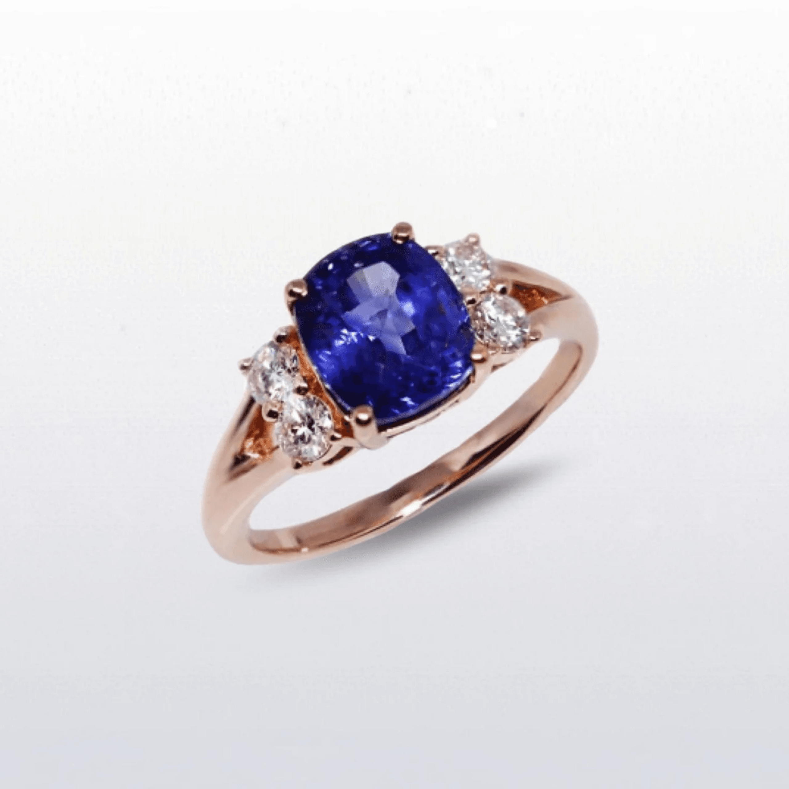 A refined rose gold ring centred with a 2.98ct blue sapphire, prized for its rich colour and depth. The sapphire is elegantly framed by sparkling diamond accents on either side, adding balance and brilliance while drawing the eye to the centre stone. Set on a warm rose gold band, the design is timeless yet distinctive.