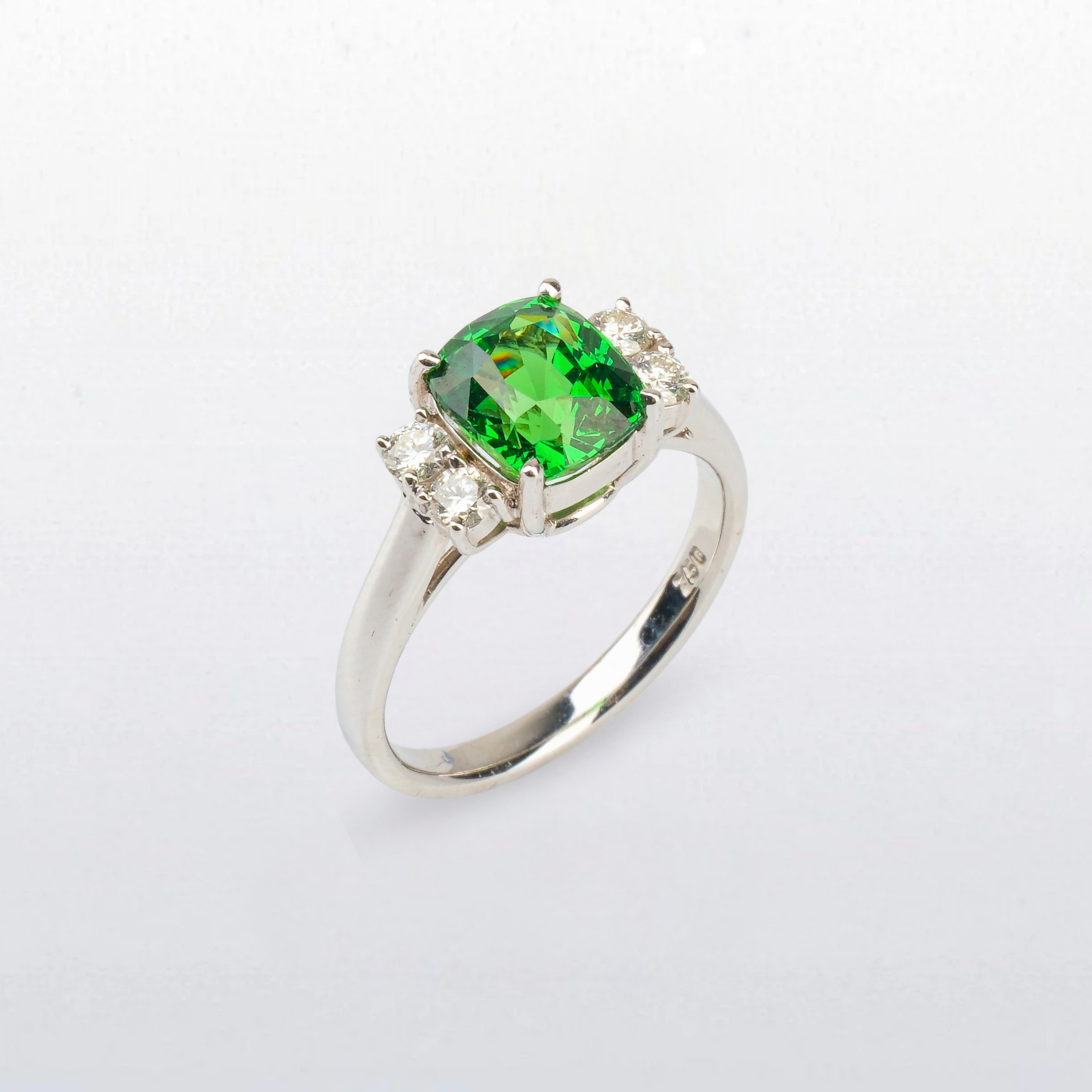 A vivid cushion-cut tsavorite commands attention with its intense green brilliance, secured in a refined white gold setting. Flanked by sparkling diamonds on either side, the design enhances the gemstone’s natural fire while maintaining a clean, elegant silhouette.