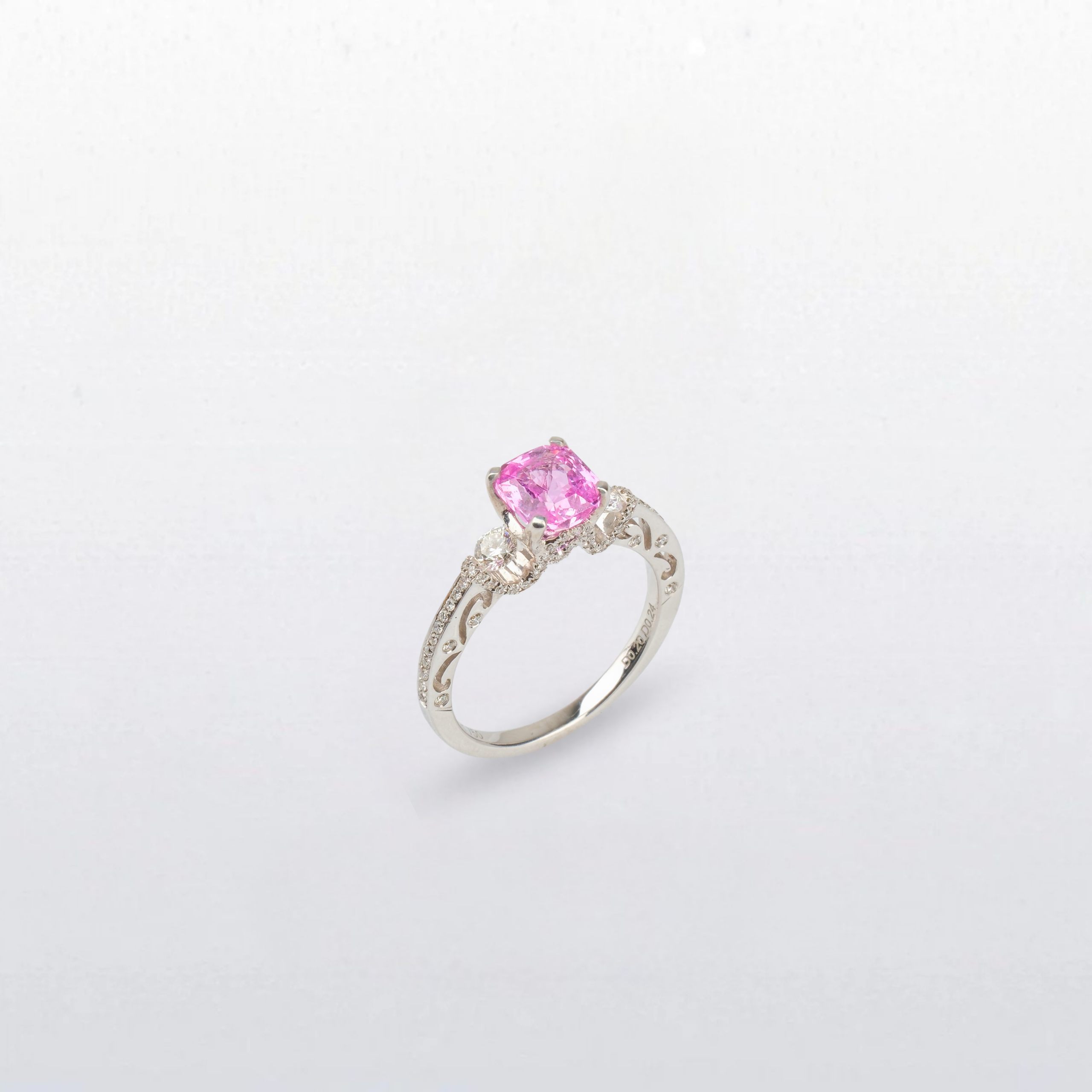 A captivating unheated pink sapphire takes centre stage, prized for its natural blush hue and exceptional brilliance. Set in white gold and surrounded by diamonds, the design is enhanced with intricate filigree detailing along the band, adding depth and refined craftsmanship to its silhouette.