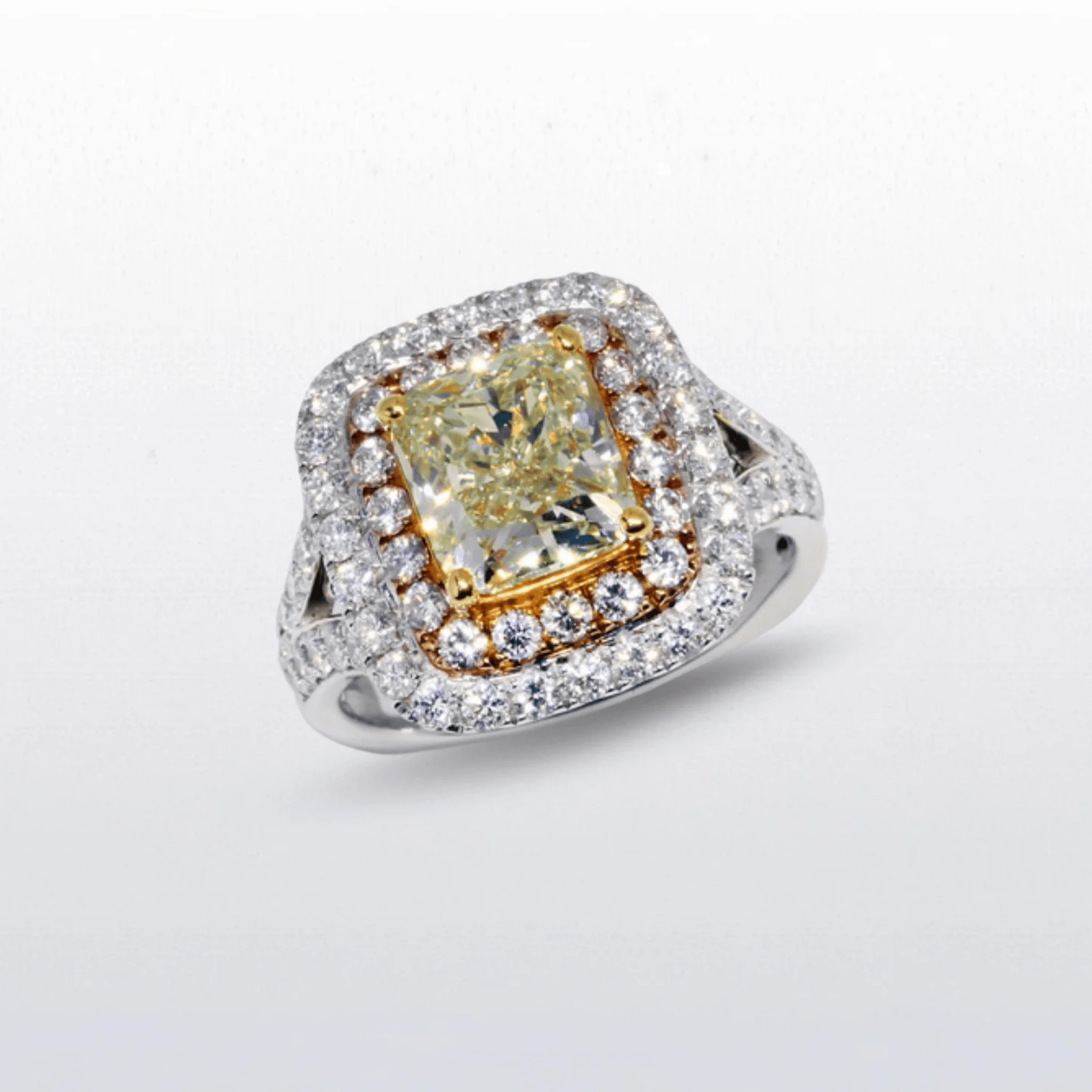 A radiant yellow diamond (2.73ct) takes centre stage in this striking double-halo design, framed first by pink diamonds and then by a brilliant white diamond halo. The split shank adds balance and sparkle, creating a luxurious statement ring with timeless appeal.