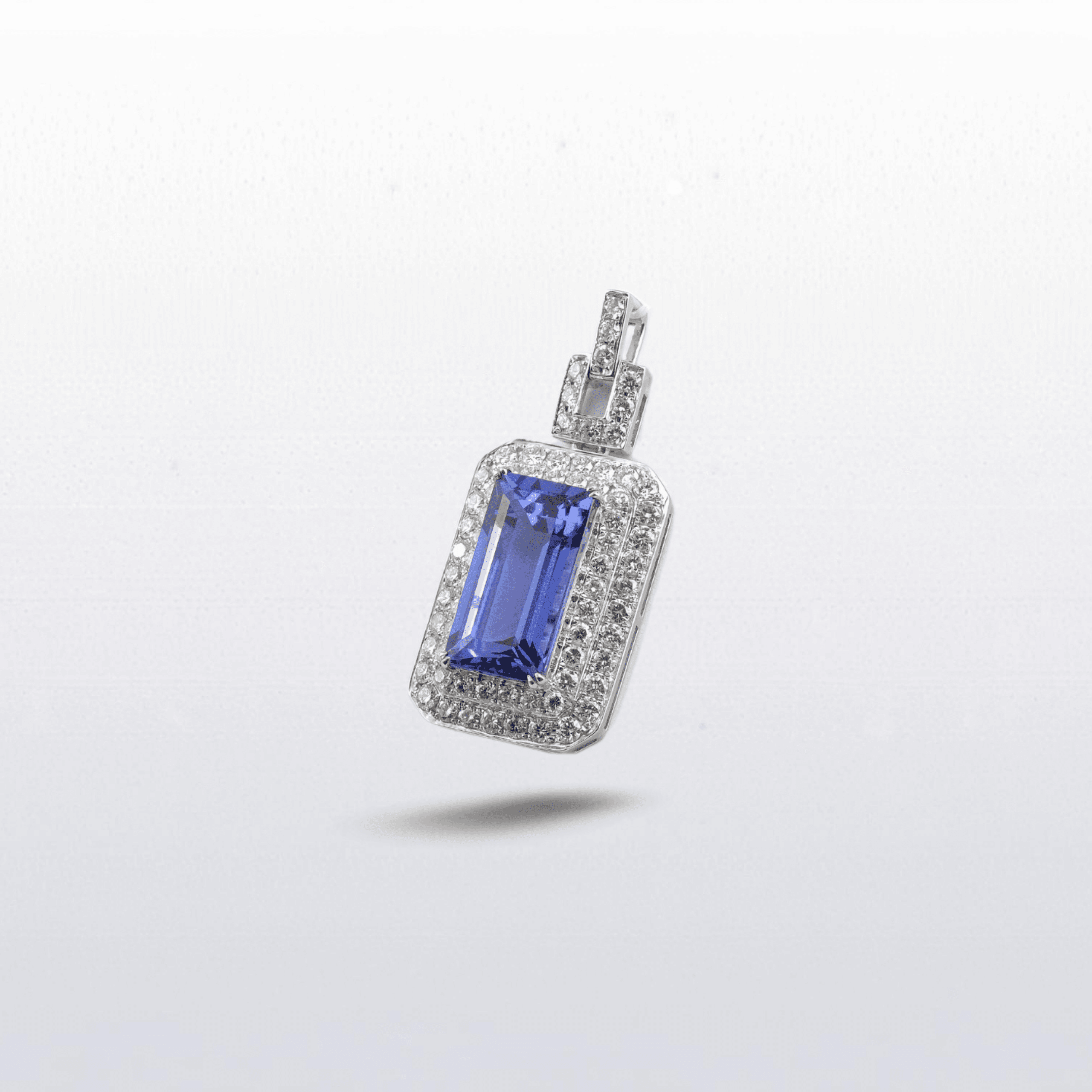 A striking statement of colour and brilliance, this pendant features a vivid 7.15-carat emerald-cut tanzanite framed by a halo of sparkling diamonds. Its clean, modern silhouette highlights the gem’s captivating blue-violet hue, offering timeless sophistication with contemporary appeal.