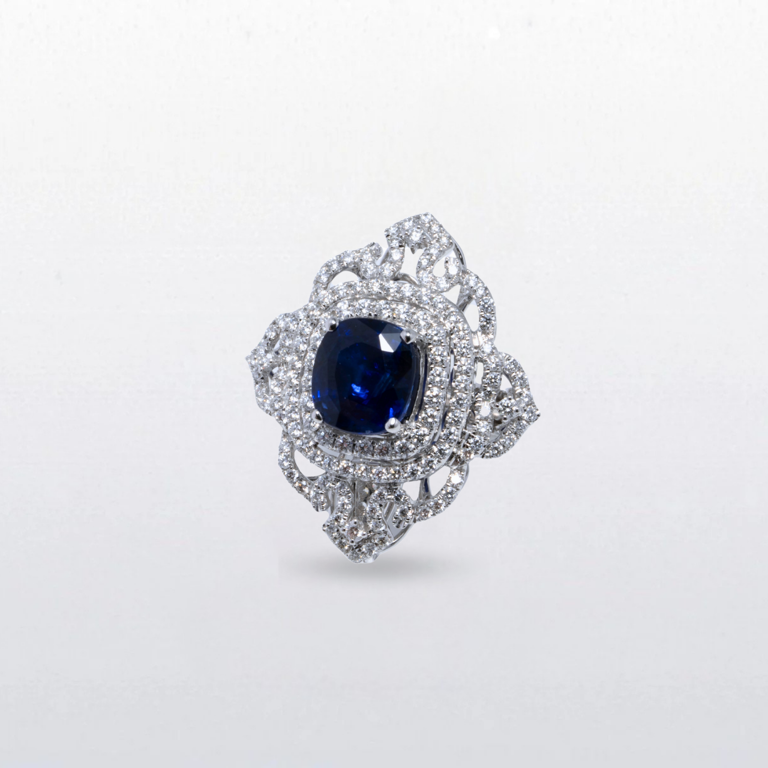 A captivating ring centred on a 6.17-carat deep blue sapphire, prized for its rich colour and natural brilliance. Surrounded by intricately set diamonds, the design unfolds in a delicate, lace-like pattern that enhances the centre stone while adding dimension and light from every angle.