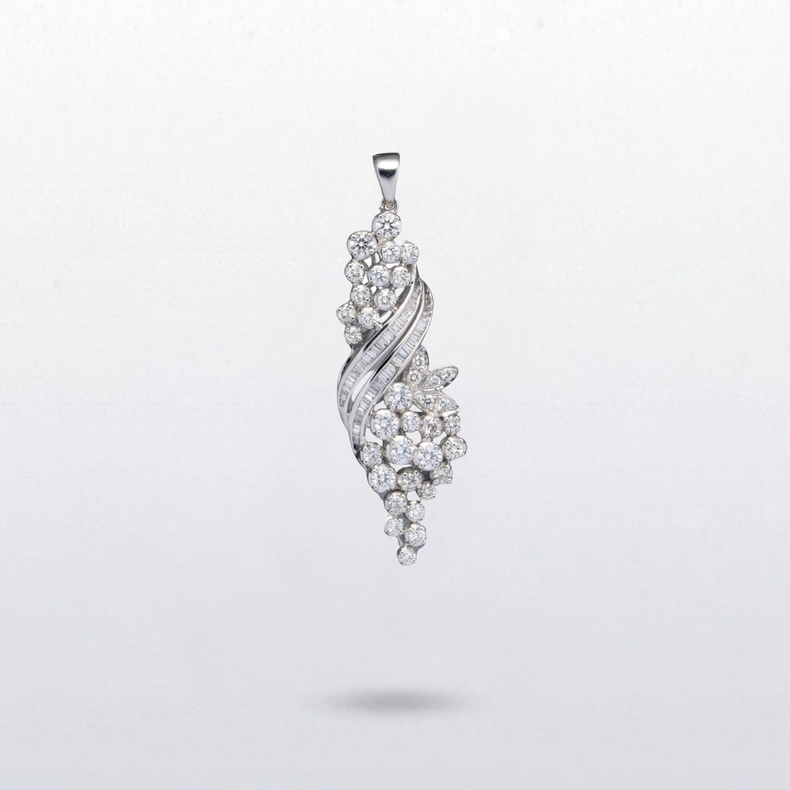 A flowing diamond pendant shaped in a gentle twist, adorned with clusters of brilliant stones that cascade along its form. Elegant and luminous, it captures a sense of movement and grace — a timeless piece suited for both everyday wear and special occasions like weddings.
