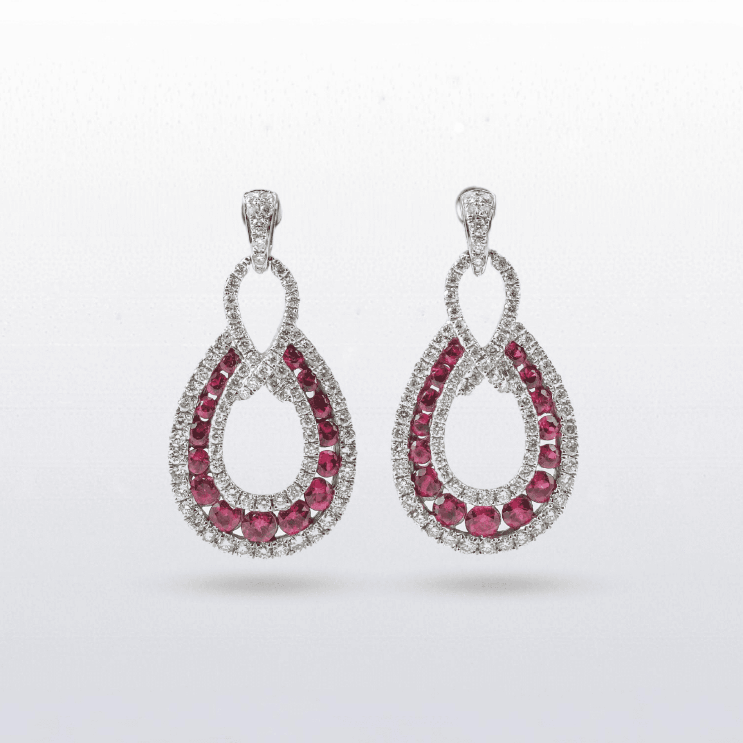 A graceful pair of drop earrings designed with teardrop silhouettes, each accented with a vibrant line of natural rubies framed by brilliant diamonds. The contrasting sparkle and colour create a luxurious sense of depth and movement, making this pair a standout choice for evening events or special celebrations. Elegant yet striking, they add refined glamour to any occasion.