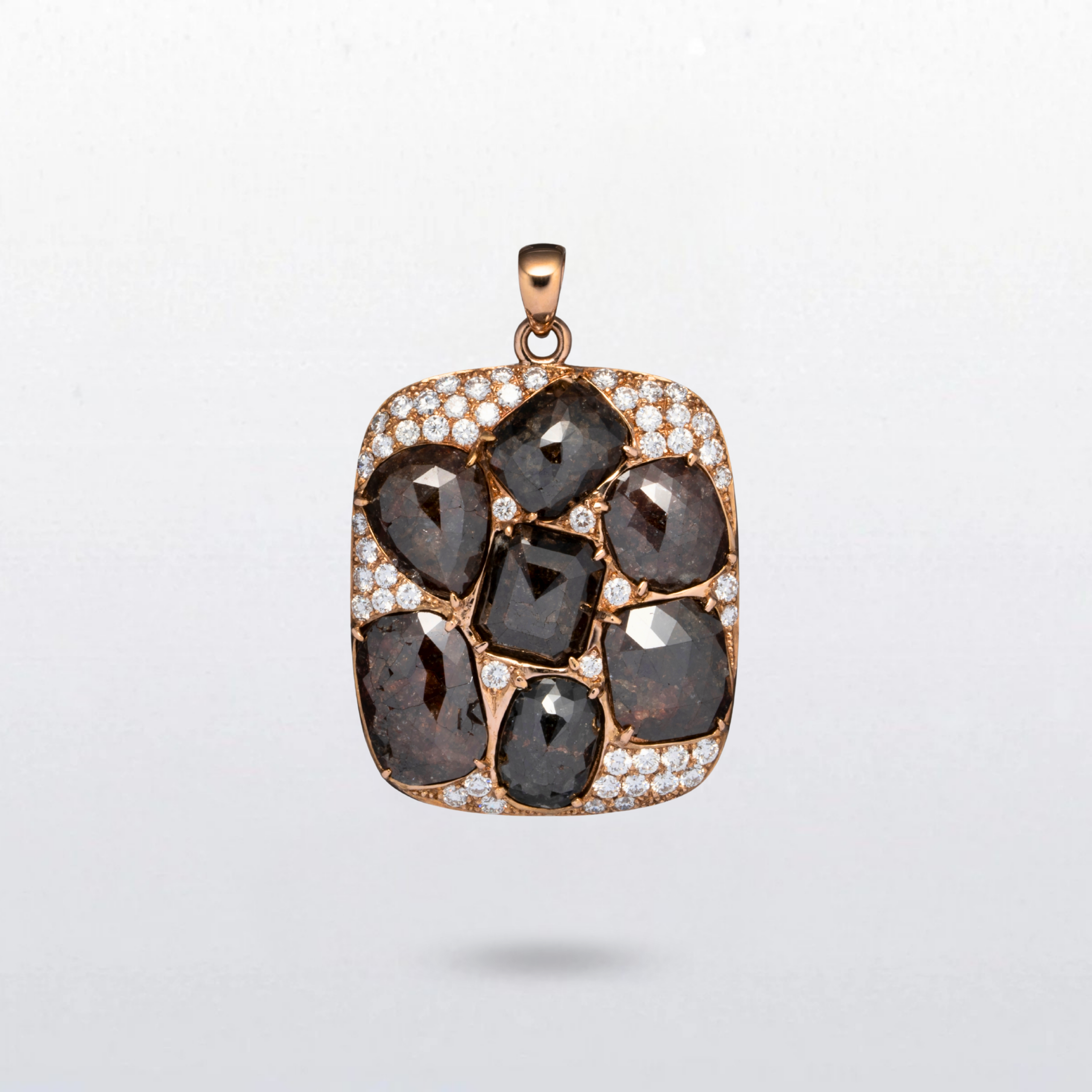 A play of contrast and character — black diamonds form a sculptural cluster at the centre, each stone distinct in shape and texture. Encircled by white diamonds, the piece captures a quiet intensity, where darkness is elevated by light.