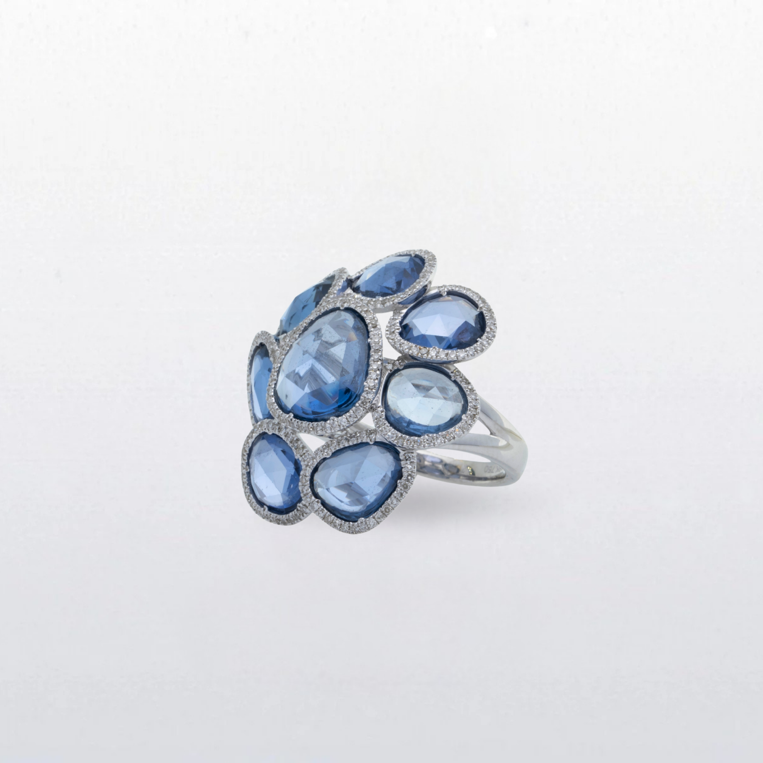 A graceful composition of blue sapphires and diamonds, brought together in a fluid, organic arrangement. Multiple sapphires in soft, luminous tones are set across the design, each framed by a delicate halo of diamonds that enhances their brilliance and creates gentle movement across the piece.