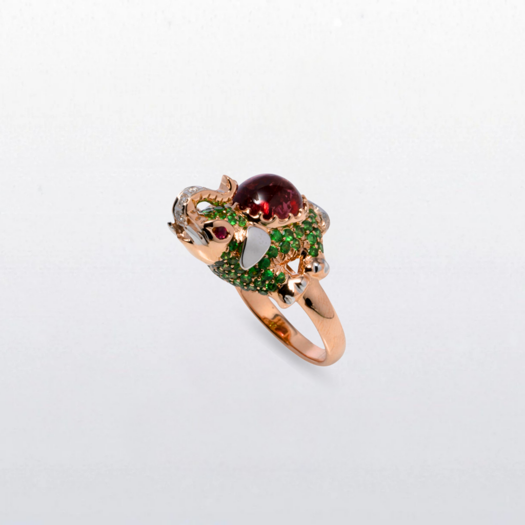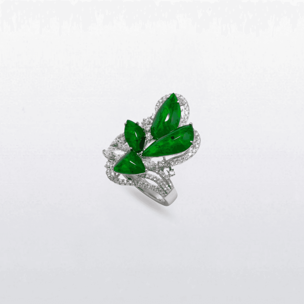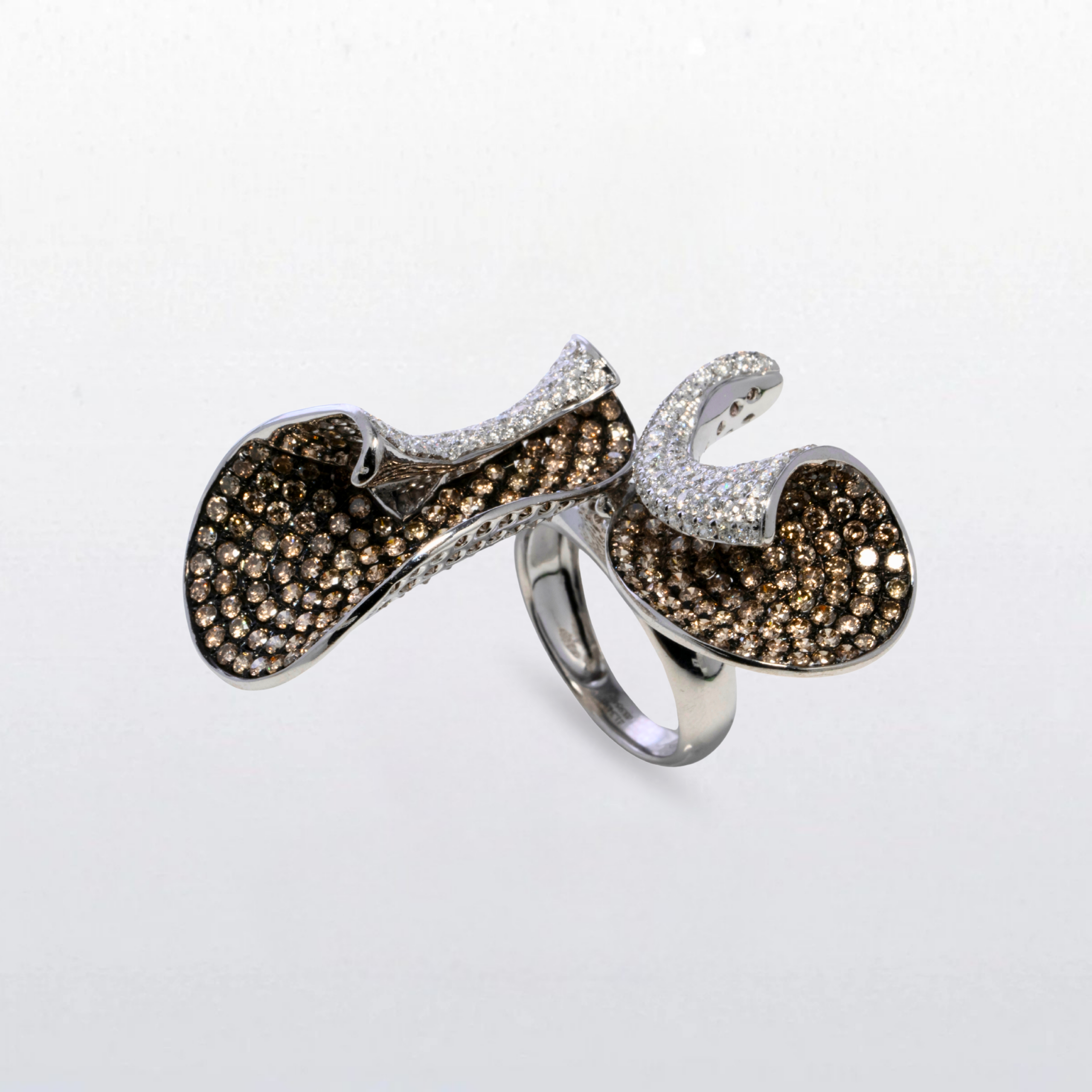 A sculptural diamond ring with flowing, ribbon-like forms set in contrasting tones. Coloured diamonds create depth across the sweeping curves — an artistic piece that blends movement, texture, and modern elegance.